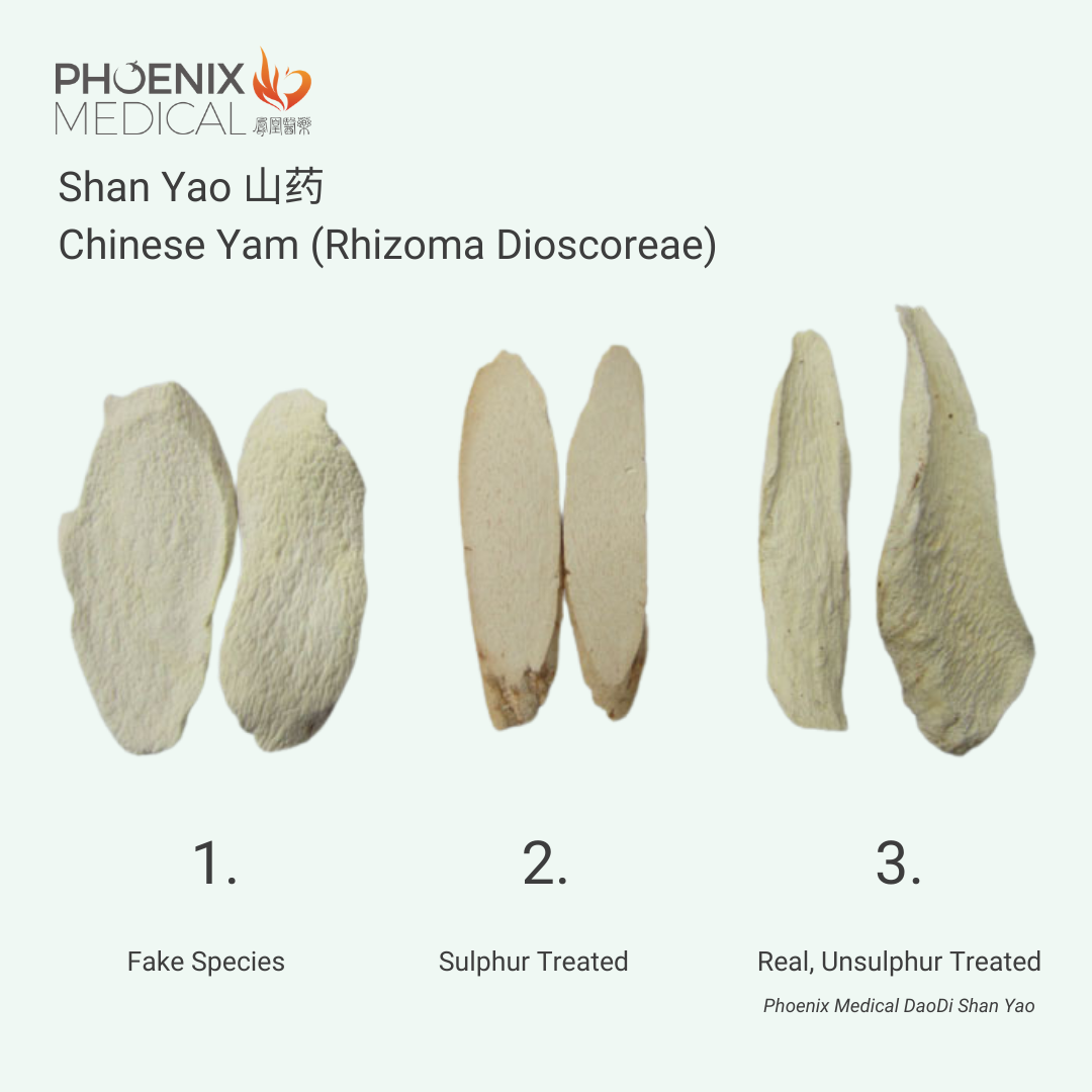 3. The Shan Yao on the right is authentic, not treated with sulphur and also not grown with pesticides or herbicides. At Phoenix, we ensure that all of our herbs are 100% authentic and grown according to the DaoDi principle; grown at the right place, harvested at the right time. We never use sulphur, pesticides or herbicides because these chemicals can alter the efficacy and treatment effects, putting patients at risk. We had helped Christine Leon at Kew Botanical Gardens develop her new book "Chinese Medicinal Plants, Herbal Drugs and Substitutes", and we highly recommend this book if you're a herbalist. The book goes into great detail in distinguishing the characteristics of Chinese medicinal herbs, viable substitutes and also the counterfeit imposters.